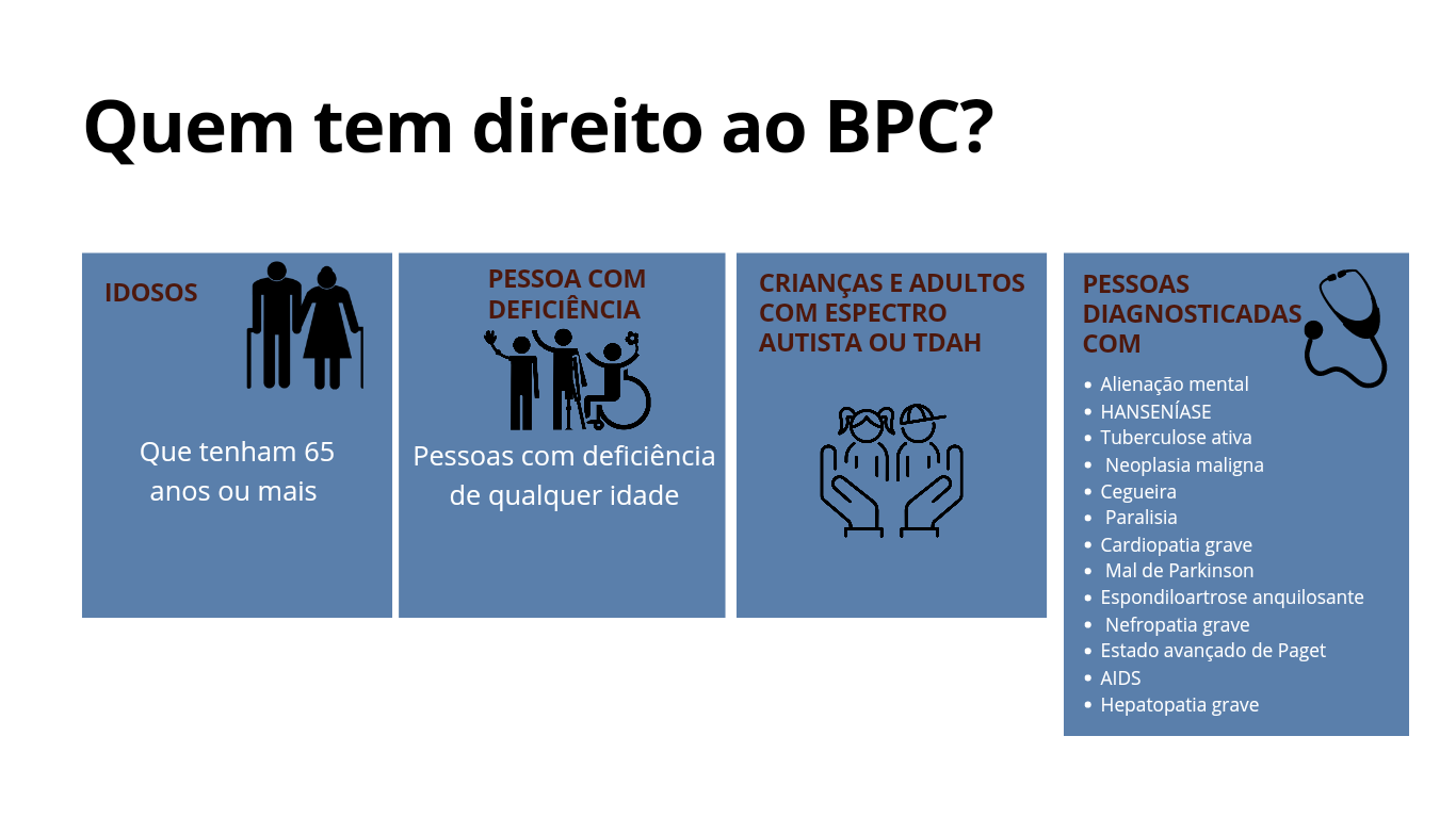 O BPC LOAS é um benefício de assistência social pago mensalmente no valor de um salário mínimo para Idosos (com 65 anos ou mais)e a Pessoa com Deficiência ( com impedimento de natureza física, mental, intelectual ou sensorial com duração mínima de 2 anos) que comprovar não possuir renda para se sustentar de maneira digna.
